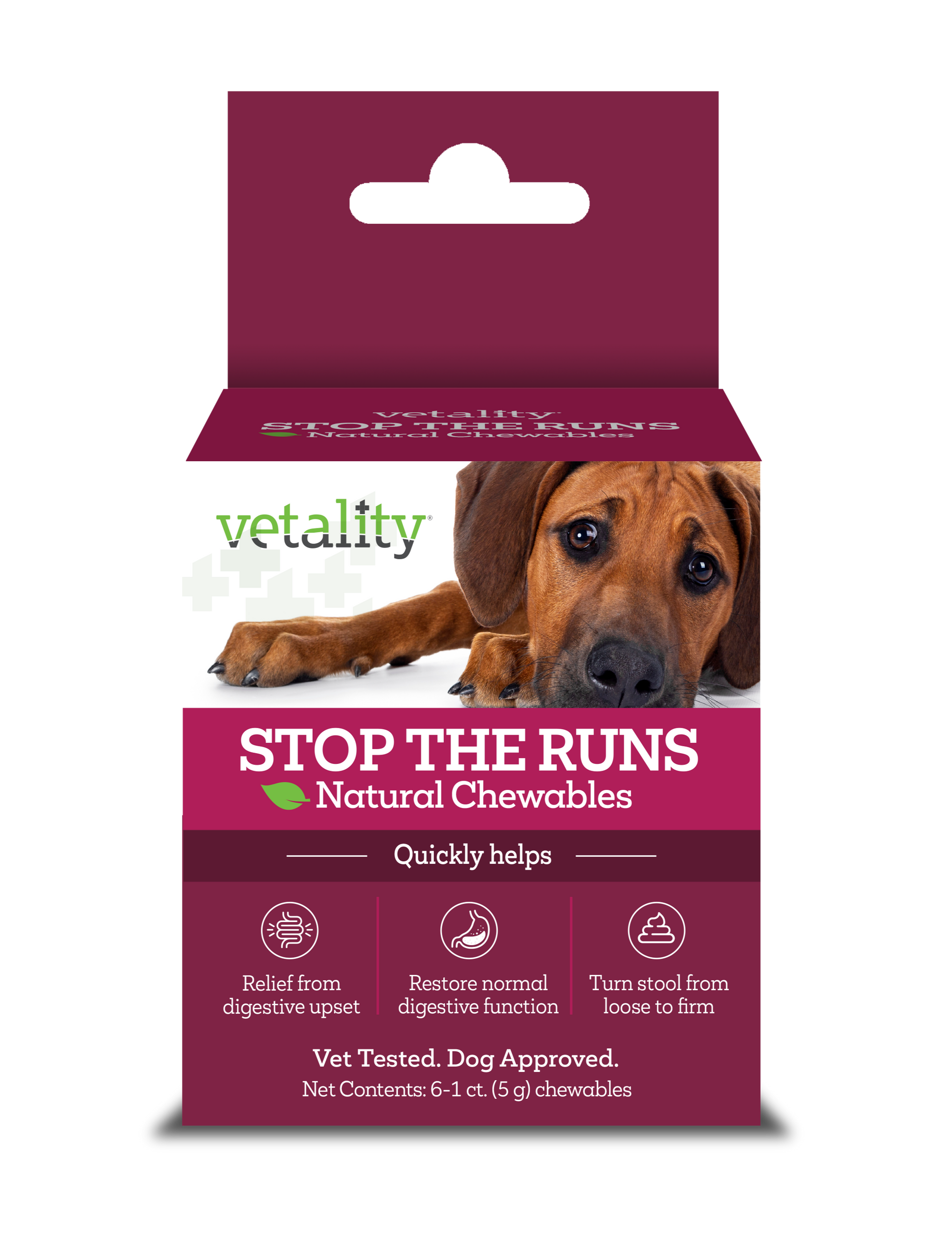 Stop the Runs' Anti-Diarrhea Chewables for Dogs helps turn your dog stools from loose to firm. This fast-acting, all-natural, easy-to-use chewable, optimized for taste, contains a complex composition of natural extracts to help regulate gut activity. Tested and recommended by veterinarians, it is perfect for travel & diet changes. For dog & puppies of all ages & sizes.